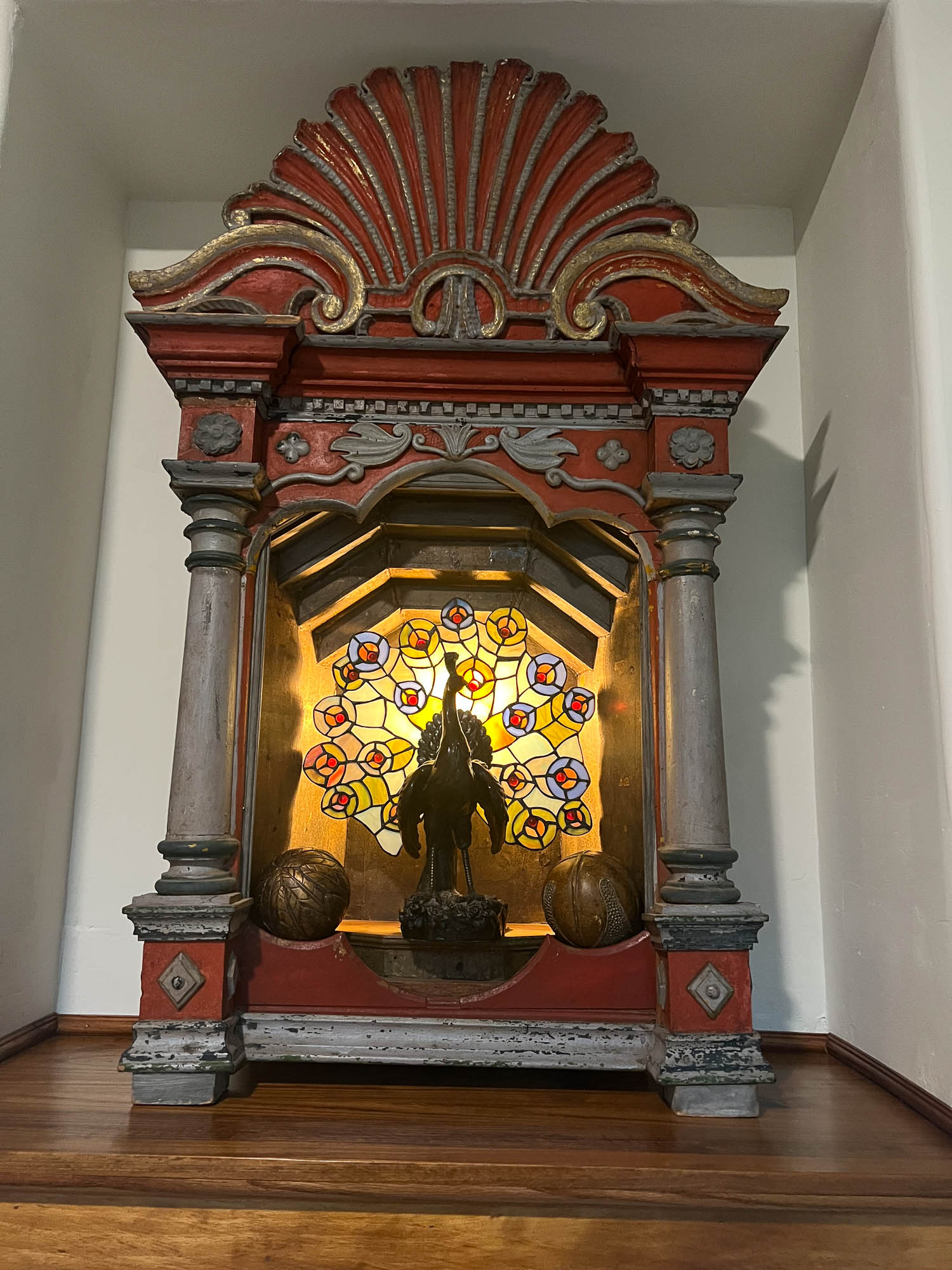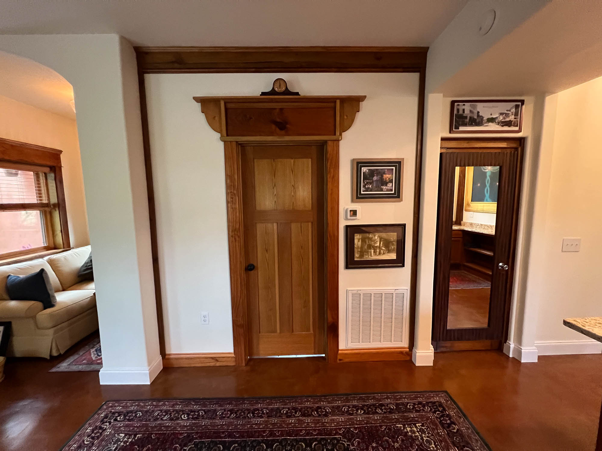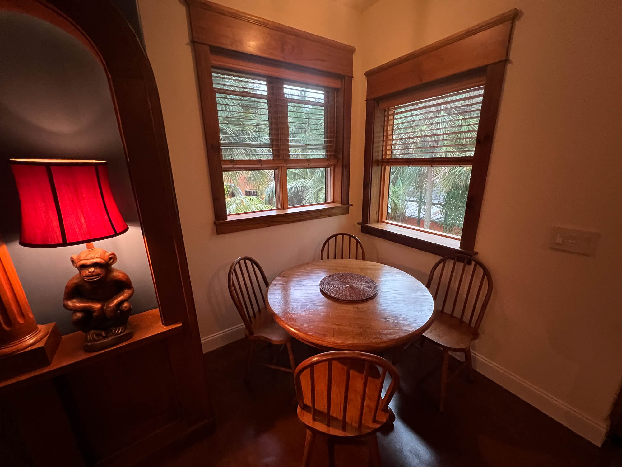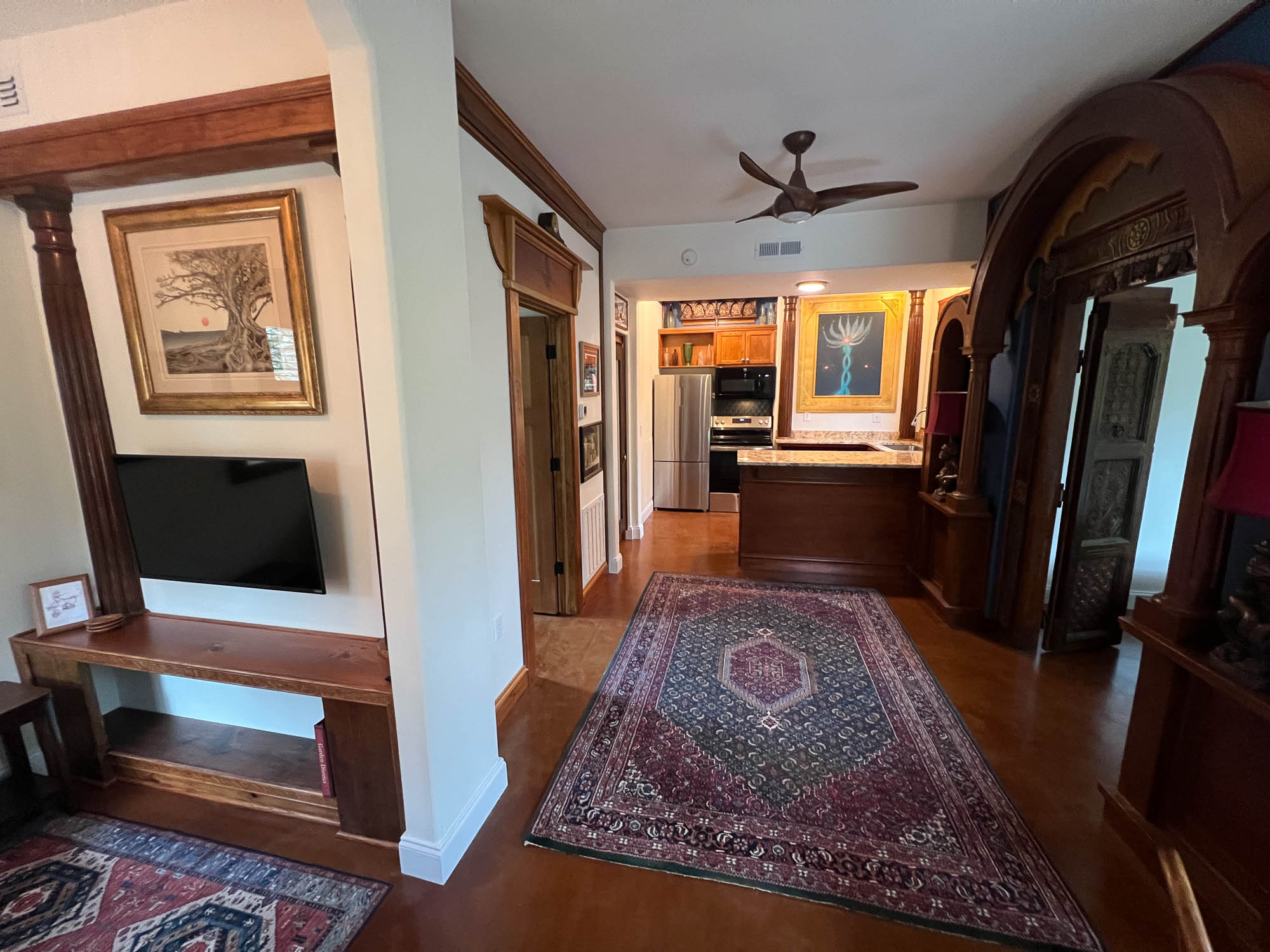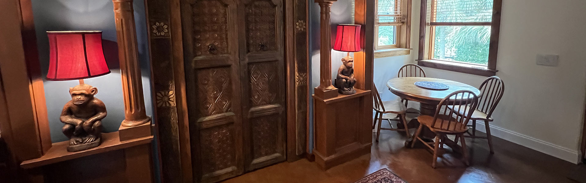 The Casita is a complete apartment with a separate bedroom accessible through an arch and Indian temple portal. The Casita has a full kitchen, laundry, and closet, dining area, and media room. The TV can swivel for viewing from the dining area. The bathroom in the Casita has a two-person soaking tub with a shower option.